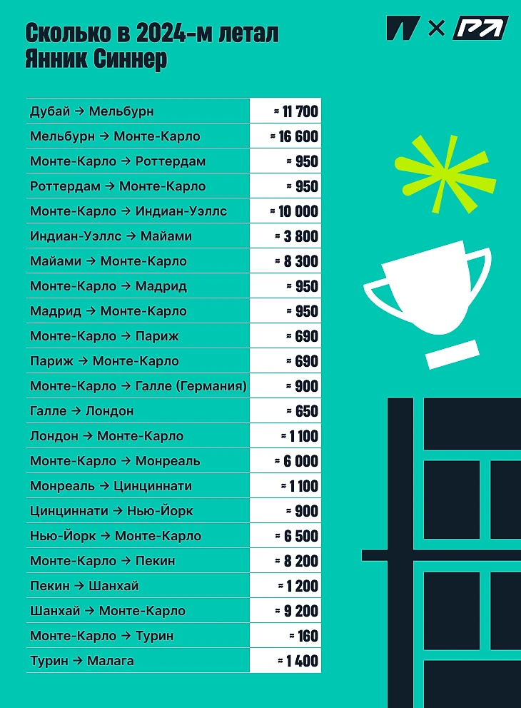 И в целом путешествия Синнера составили примерно 100 тысяч километров. Хотя он, например, не поехал на турниры на Ближнем Востоке и после китайской серии не играл до итогового турнира.