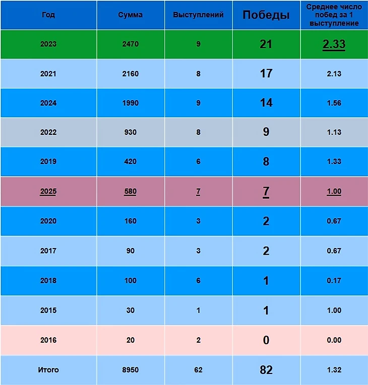 Число побед по отдельным годам: