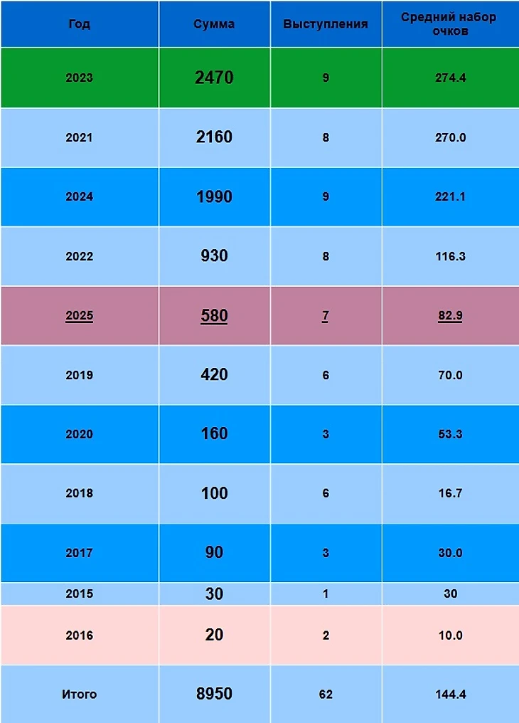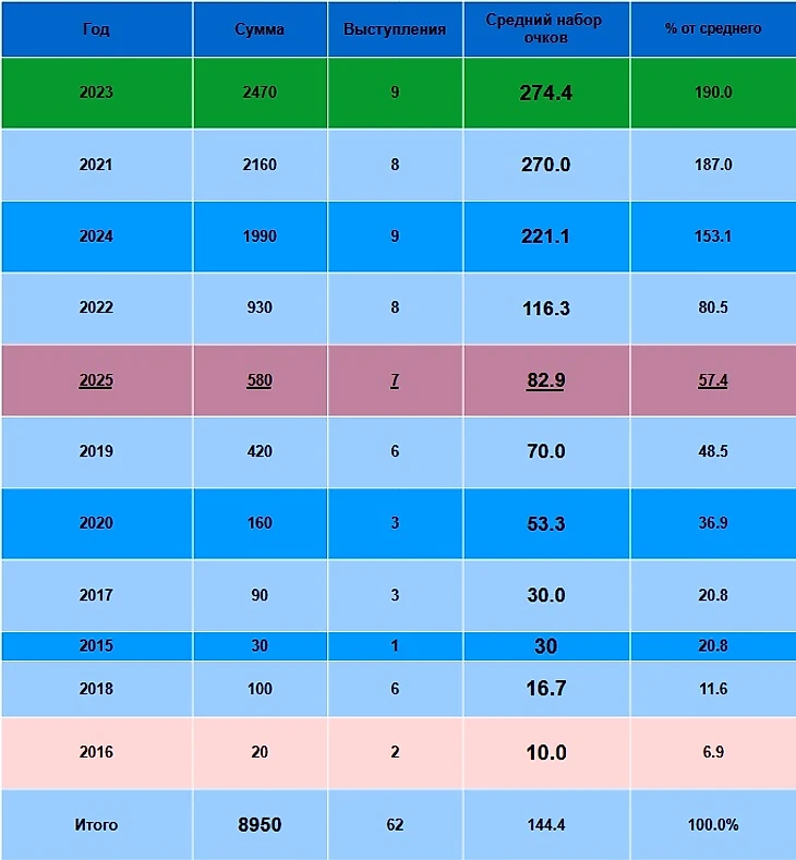 82.9 вместо 144.4. Средним результатом в 2025 было бы 1011 очков вместо 580!
