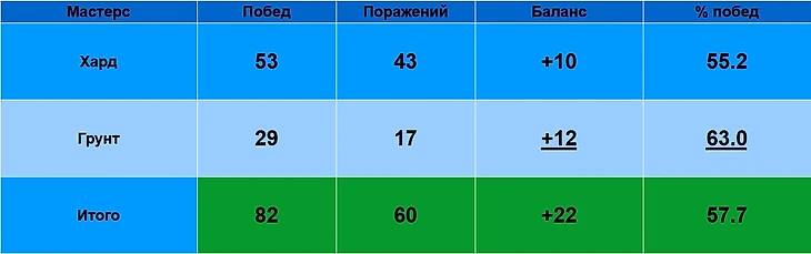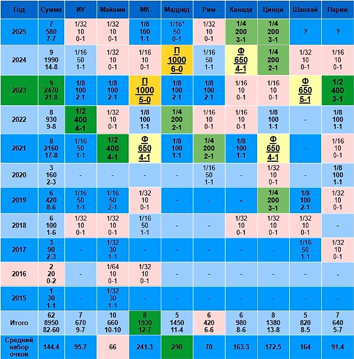 Андрей Рублев на Мастерсах, статистика на 24.08.2025