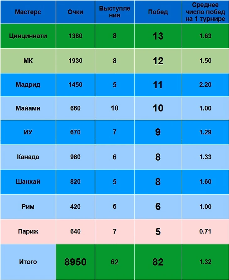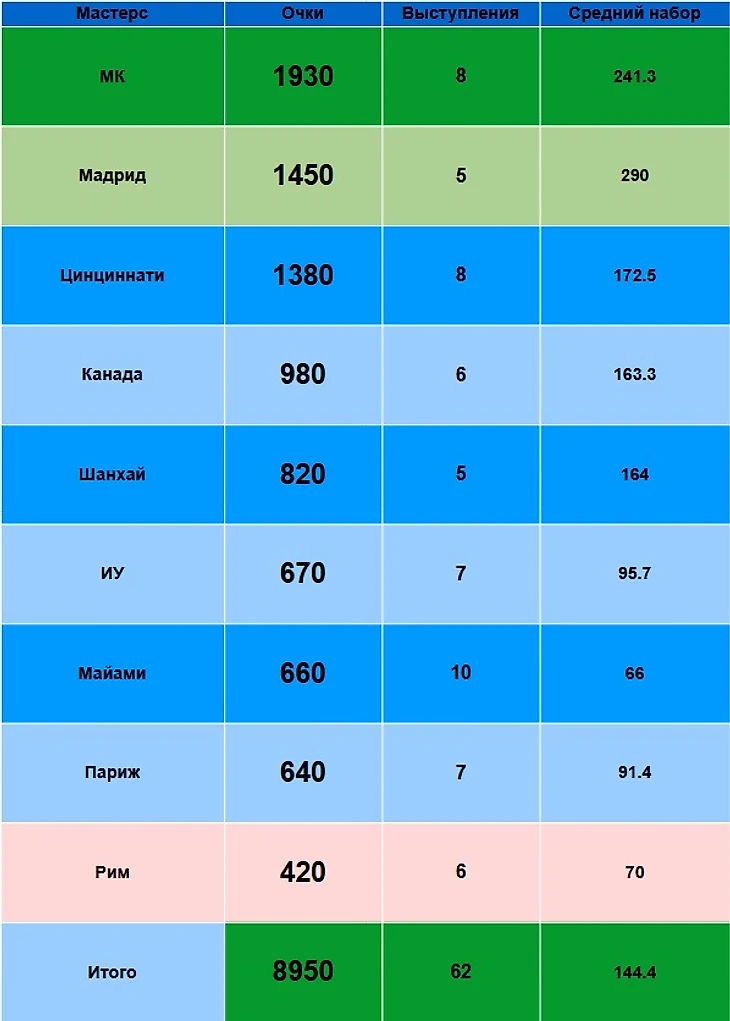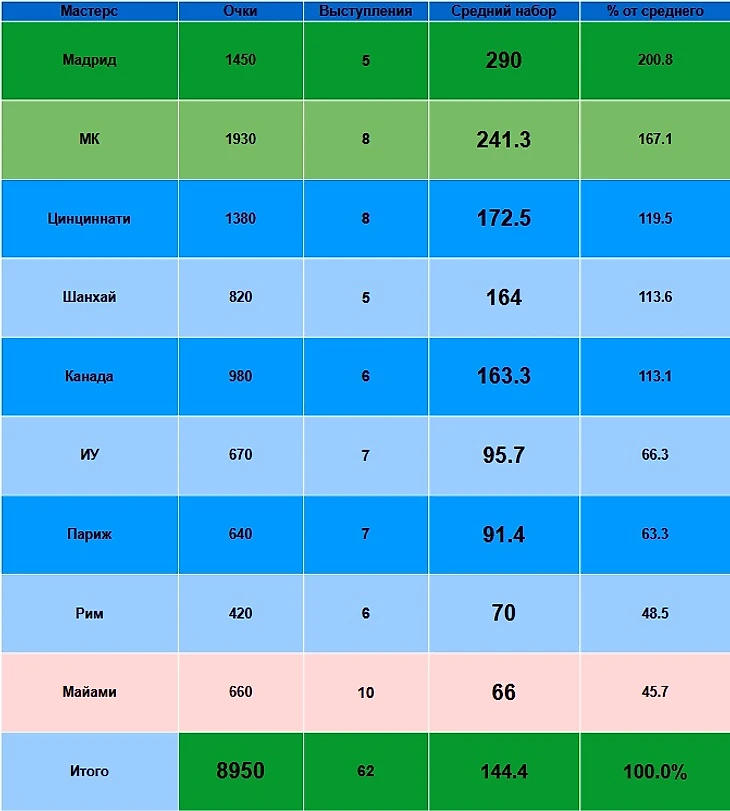 Неудивительно, ведь число сыгранных Мастерсов очень разное: от 5 в Шанхае и Мадриде до 10 в Майами.