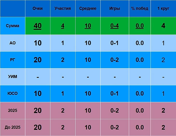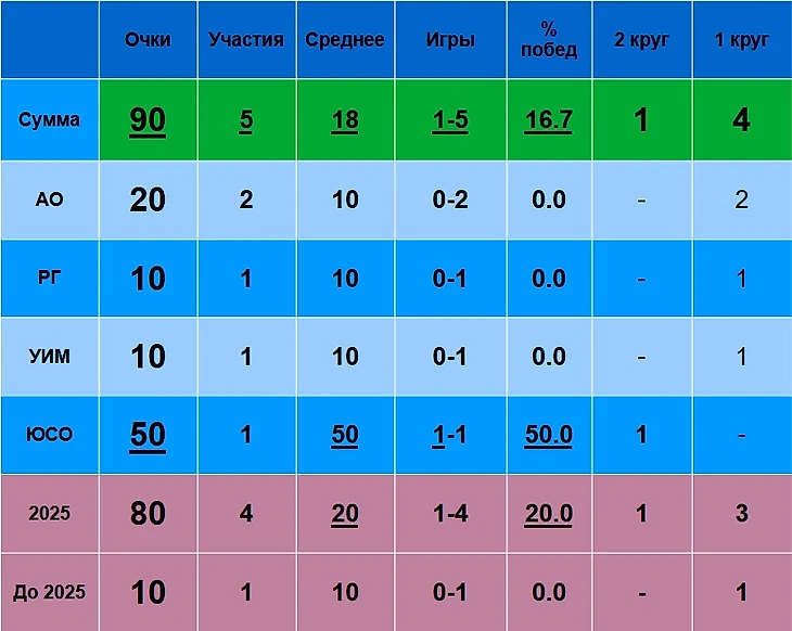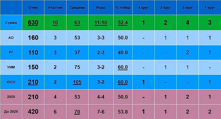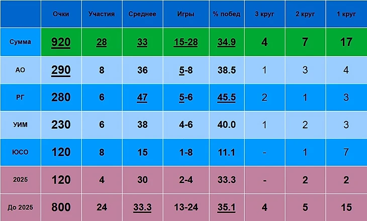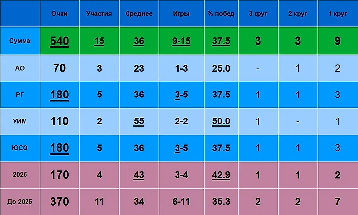 Худший Шлем: АО – 220 очков, 37 в среднем, 4 победы, 40.0% побед.
