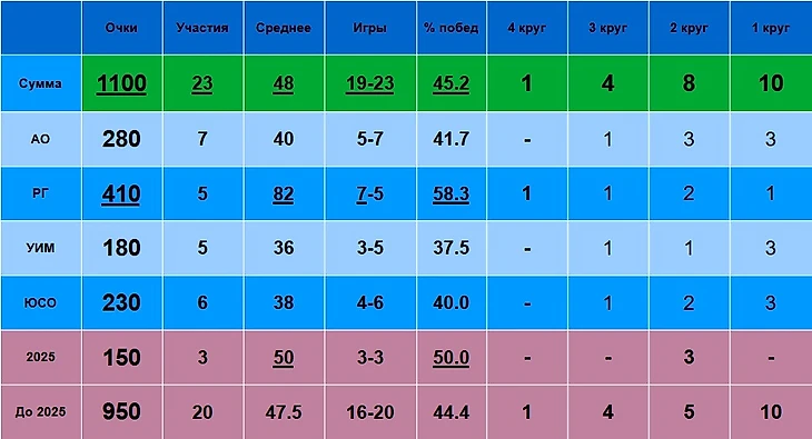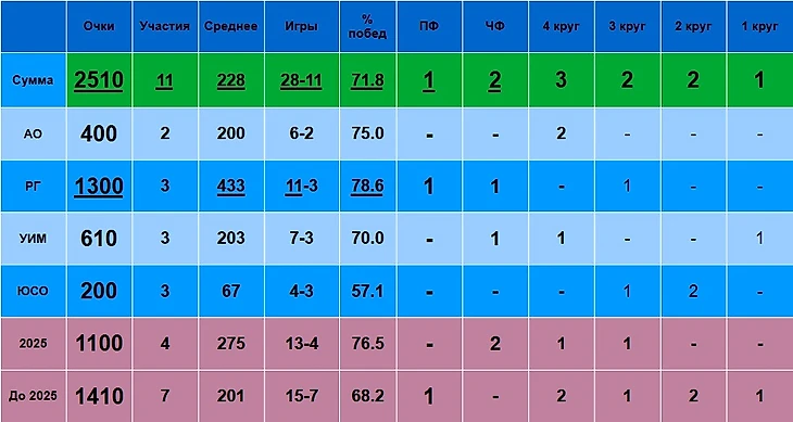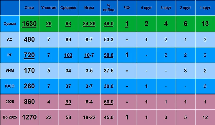 Лучший Шлем: РГ – 1300 очков, 433 очка в среднем, 11 побед, 78.6% побед.