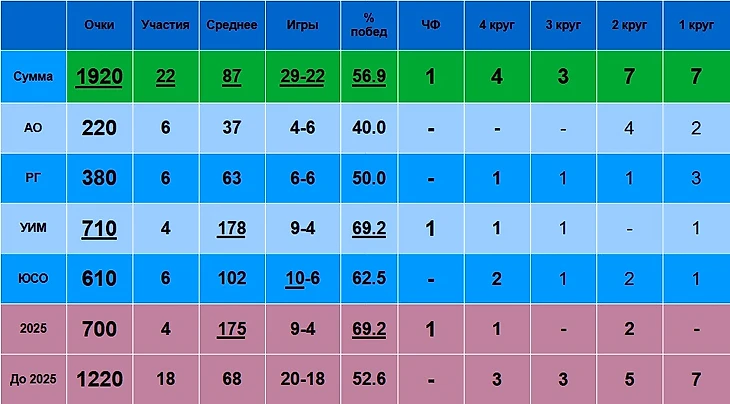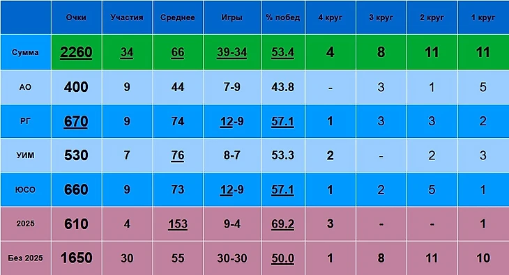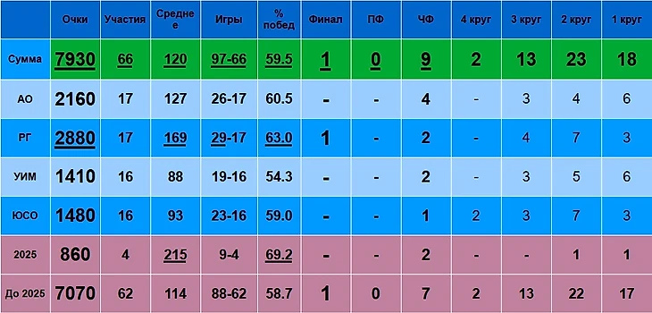 Лучший Шлем: РГ – 2880 очков, 169 очков в среднем, 29 побед, 63.0% побед.
