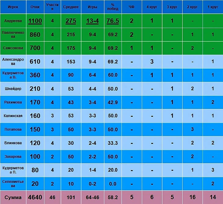Андреева – лучшая по общему числу очков(1100), по среднему набору за 1 турнир(275), по числу побед(13) и по проценту побед(76.5). Абсолютная победа!