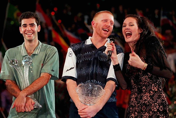 Сампрас стал первым игроком, бравшим пять титулов итогового в двух разных локациях (Франкфурте и Гановере). Защитил он титул, впрочем, только однажды – когда в финале-1997 обыграл Евгения Кафельникова. На фото – церемония после финала годом раньше, которую американец выиграл у Бориса Беккера в пятисетовом матче с тремя тай-брейками (3:6, 7:6, 7:6, 6:7, 6:4).