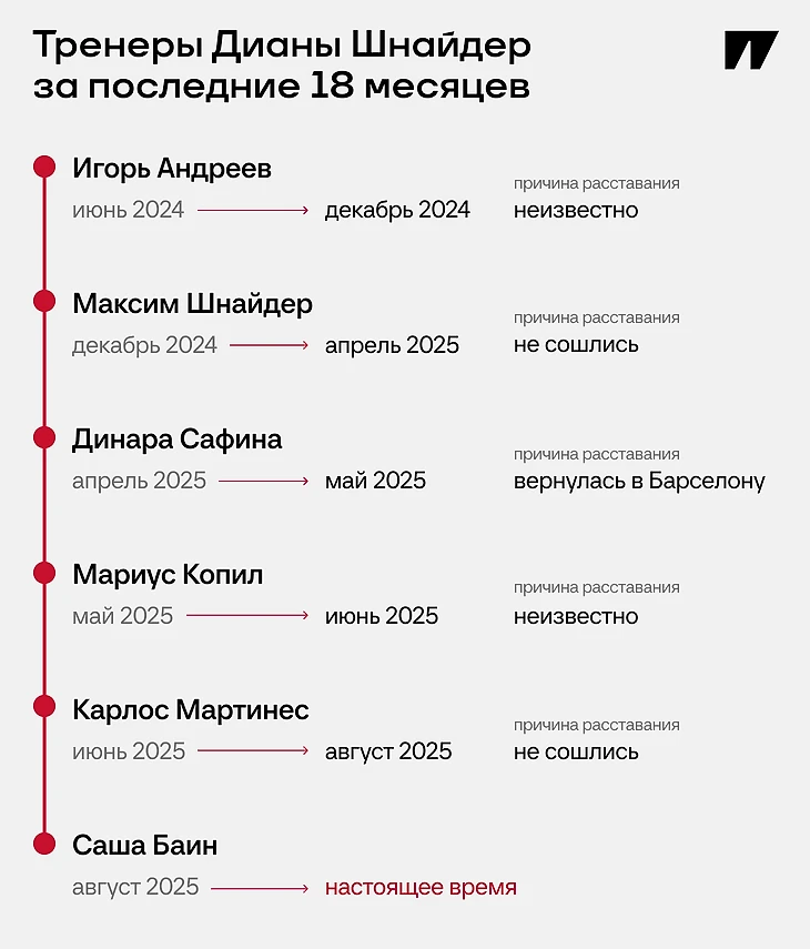Перед предсезонкой-2024 внезапно закончилось сотрудничество с Игорем Андреевым, с которым она выиграла три титула за полгода. Россиянка вернулась к отцу, периодически тренировавшему ее и раньше, но ход был не самым удачным – на первом хардовом отрезке у Шнайдер было больше поражений, чем побед. После Australian Open не получалось выиграть даже двух матчей подряд.