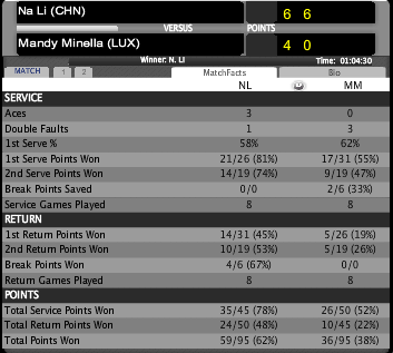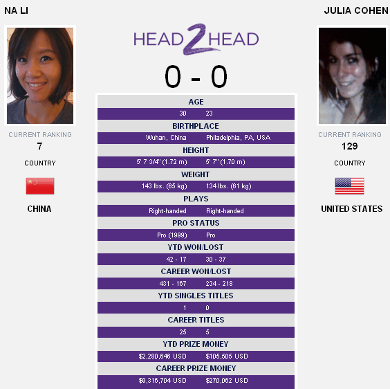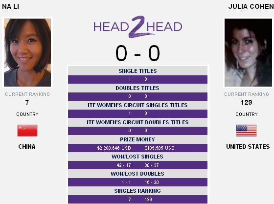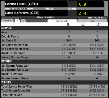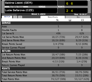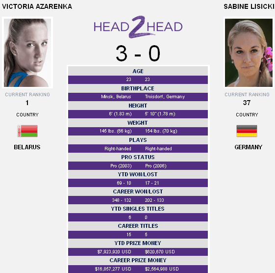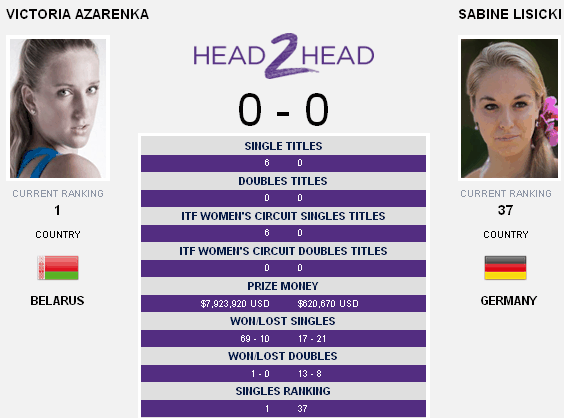 В личном счете ведет 3:0 против Лисицки, но показателен может быть только их матч в Пекине. Я ожидаю что опять Вика победит, хотя Сабин может затруднить ее серьезно. Корт в Брисбене дает преимущество более активным, более атакующем игрокам, а Сабин как раз такой игрок. Но на корте есть постоянный ветер с моря и он может помешать подачу и ударов Лисицки, которой не отличается стабильности. Наоборот Вика стабильнее, меньше ошибается и я думаю это и решит выхода матча.Лисицки имеет только одну победу против намбаванку - против Марию на Уим в прошлом году. Впервые участвует в Брисбене.