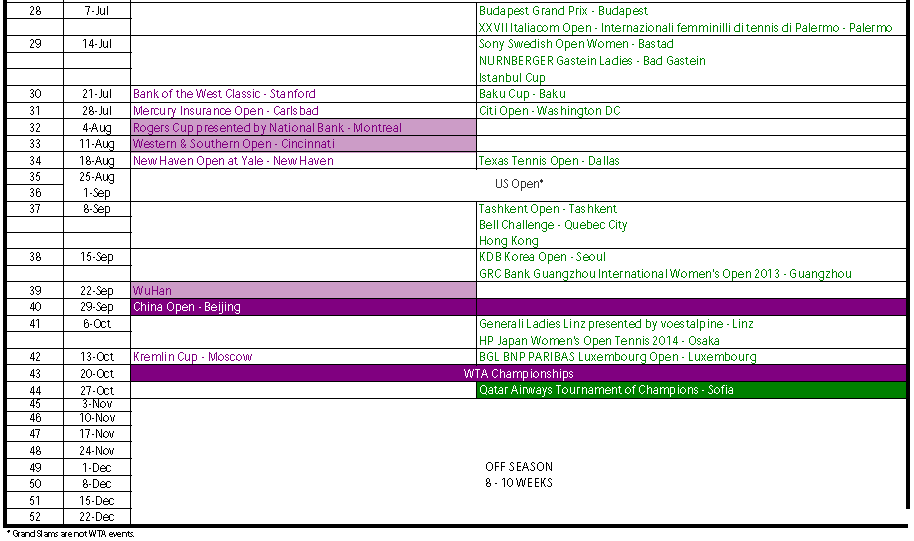 Календарь 2014 года был утвержден. Совет Директоров WTA утвердил следующий календарь: