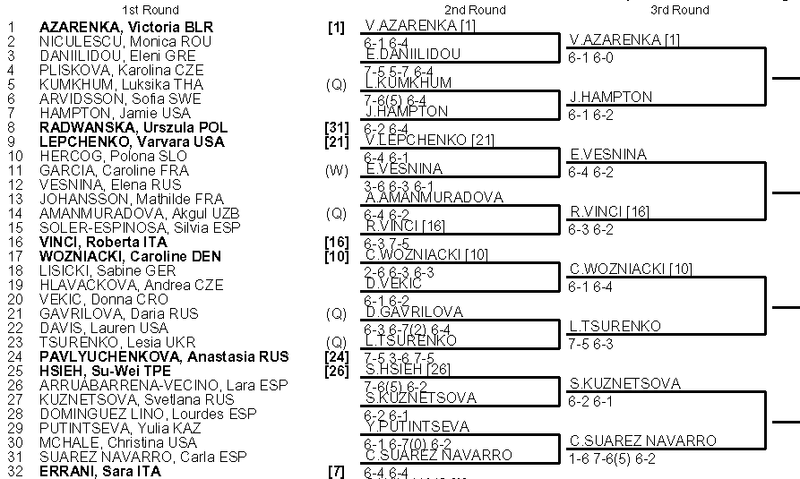 Предпоследняя восьмёрка возглавляется Сюй Цзинвэнь (5), высокий рейтинг которой обусловлен успешными выступлениями в региональных турнирах, и Кристиной Макаровой (9). Но уже в первом круге Кристине предстоит матч с Еленой Остапенко, которая только что одолела «саму» Синякову, а кроме того нельзя не учитывать Сандру Самир и ещё одну местную участницу сборной – Зою Хайвз.