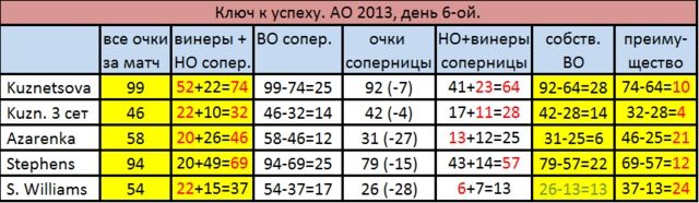 Желтым цветом введены данные для наших теннисисток – победительниц сегодняшних матчей, а в белом тоне - данные их соперниц.