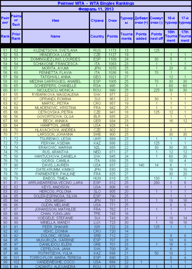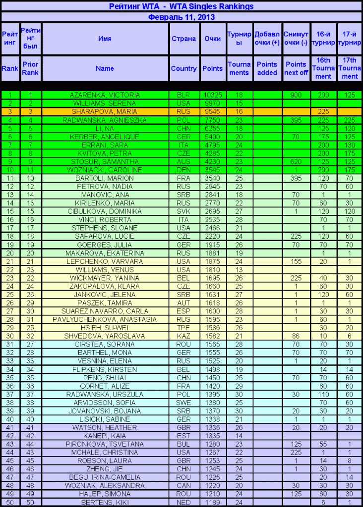 Этот рейтинг подробнее. Здесь для всех теннисисток можно увидеть сколько очки им были добавлены на этой недели, сколько очки будут сняты на следующей недели и сколько очки носит их 16-й и 17-й турнир.