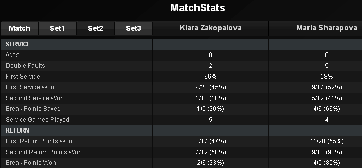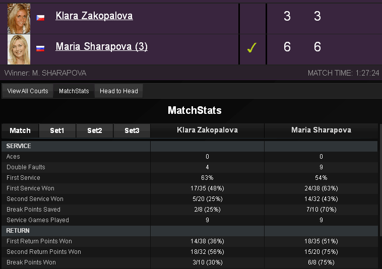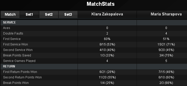 Начала матча Мария не очень хорошо, но закончила его лучше. Если не была потеря внимание и серию НО во втором сете, из-за которых Мария отдала два гейма, то могли бы сказать что как и в первом матче, во втором сете Мария играла лучше.