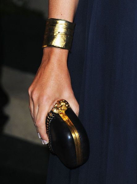 She looked stunning in a contemporary, floor-length silhouette by Amanda Wakeley which emphasized her athletic physique with relaxed and flowing tailoring and a deep-cut back. Shoes were Manolo Blahniks and the edgy yet chic clutch was an Alexander McQueen accessory. Earrings also by Isharaya and matching golden cuffs by Katherine Sultan.