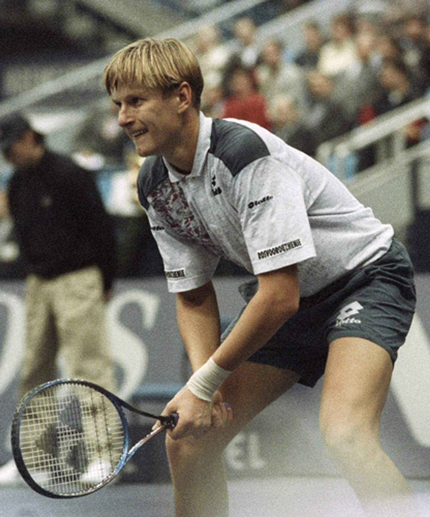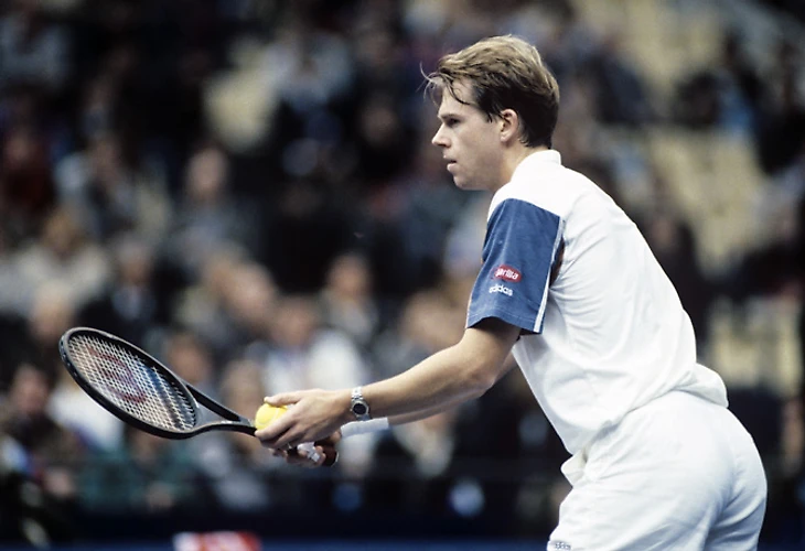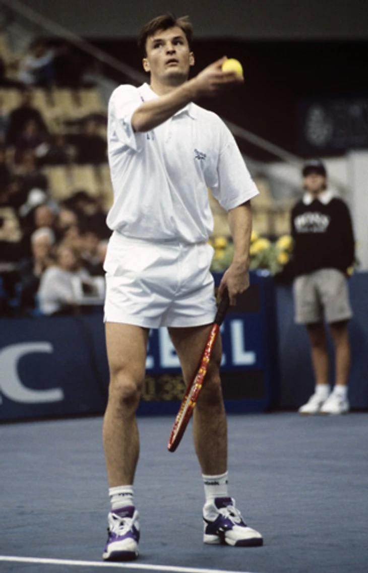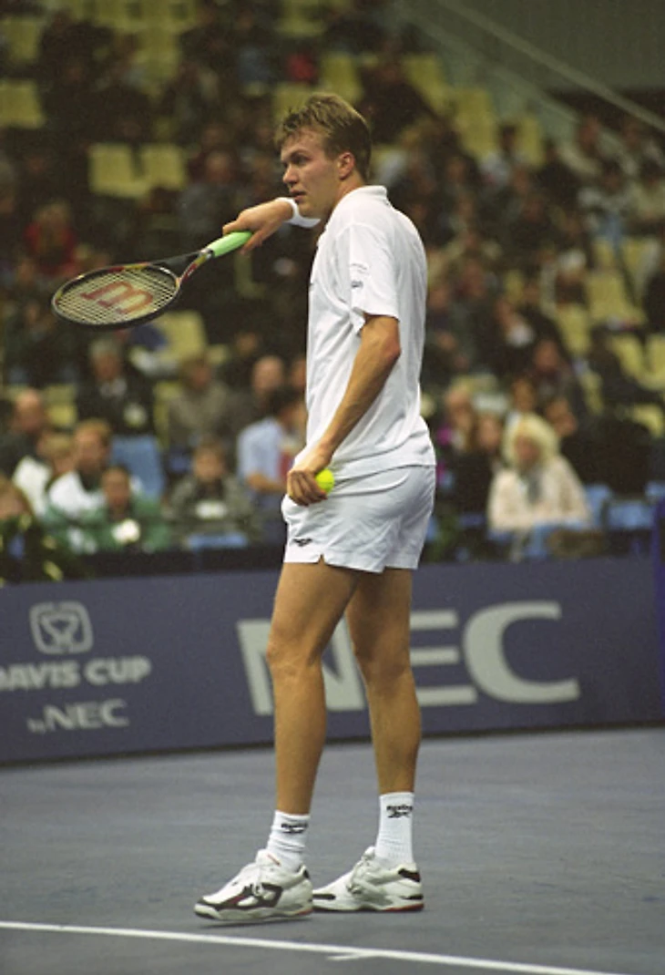 Кафельников был номинальным фаворитом в матче против Магнуса Ларссона (на фото ниже) и тоже почти совершил камбэк, проиграв две первых партии, но пятую уступил 3:6.