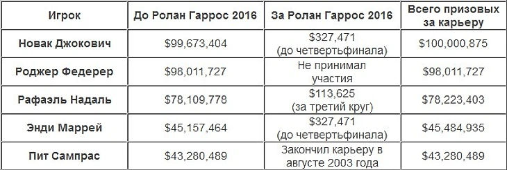 До Ролан Гаррос 2016 первая ракетка мира выиграл $99'673'404, а за выход в четвертьфинал этого турнира ему полагается ещё $327,471.