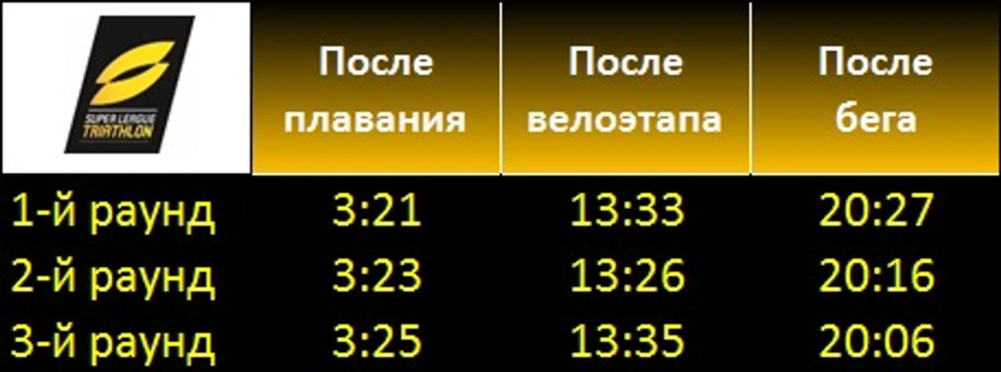 Это что касается Суперлиги в целом. Теперь о частностях. В заключительный третий день соревнований проходила гонка на выбывание. Её формат очень похож на квалификацию формулы-1. Также имеется три раунда. По итогам первого остаются 15 лучших (из 20 с небольшим), по итогам второго - 10. Эта десятка и разыгрывает победу в третьем раунде. Внутреннее наполнение этих раундов идентично: 300 м плавания, 5 км велоэтапа и 2 км бега. Суммарно это занимает порядка 20 минут, а интервал между раундами составляет 10 минут.