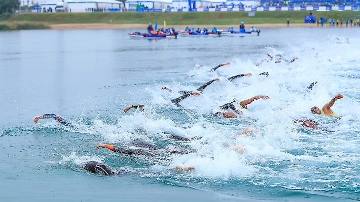 На старте нас поставили с внешнего края. Не очень удобная позиция, из-за чего пришлось сильно спринтовать на плавании и перебираться к французам. А они все трое тоже хорошо плывущие, как всем известно (двое входят в топ-4 Суперлиги триатлона в плавании после 2 этапов – прим.).