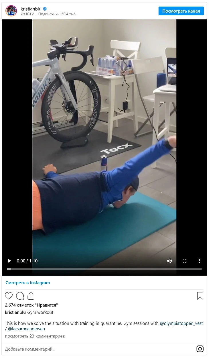 Зато упражнение, которое демонстрирует Кристиан Блюменфельт, можете повторять смело. Заодно, может, плавать научитесь. Хотя, не факт… А когда Кристиант вынырнет - сразу на велосипед, и в погоню за энергетическим напитком! Вон на стуле целая коробка стоит. Мне кажется, догонит.