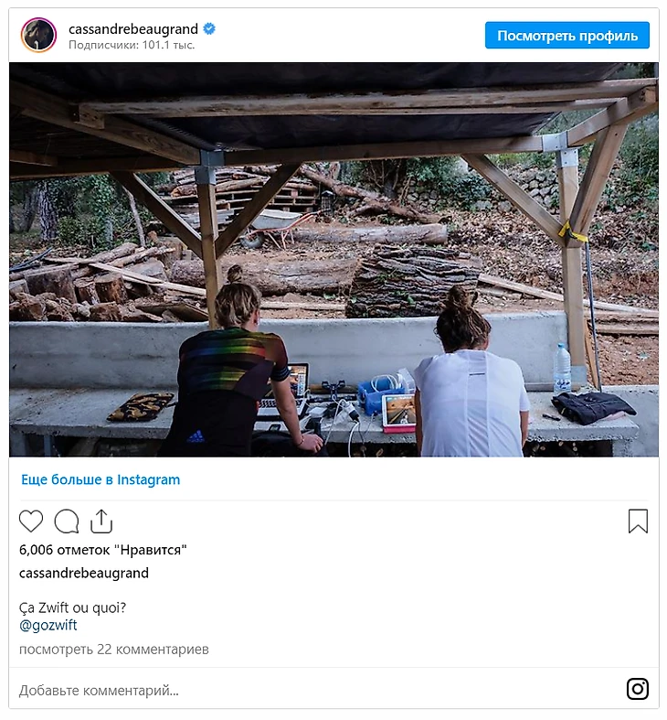 Для тех, кто не понял – слева на фото Кассандра Богран, справа Леони Перьё. Они участвуют в виртуальных гонках Zwift на велотренажёрах. Подпись под постом гласит: «Это Свифт, или что?» Действительно, глядя на бурелом перед ними, вопрос кажется законным. Надеюсь, количество поваленных деревьев не равняется количеству проигранных гонок.
