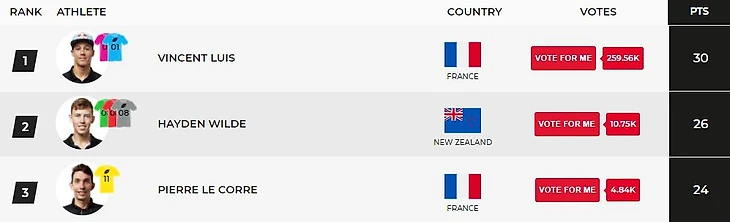 Кстати, в олимпийском рейтинге Венсан Луи второй, сразу вслед за своим другом и партнером по тренировкам Марио Мола. Зато в рейтинге ITU он первый, опережая того же Марио более чем не 500 очков.