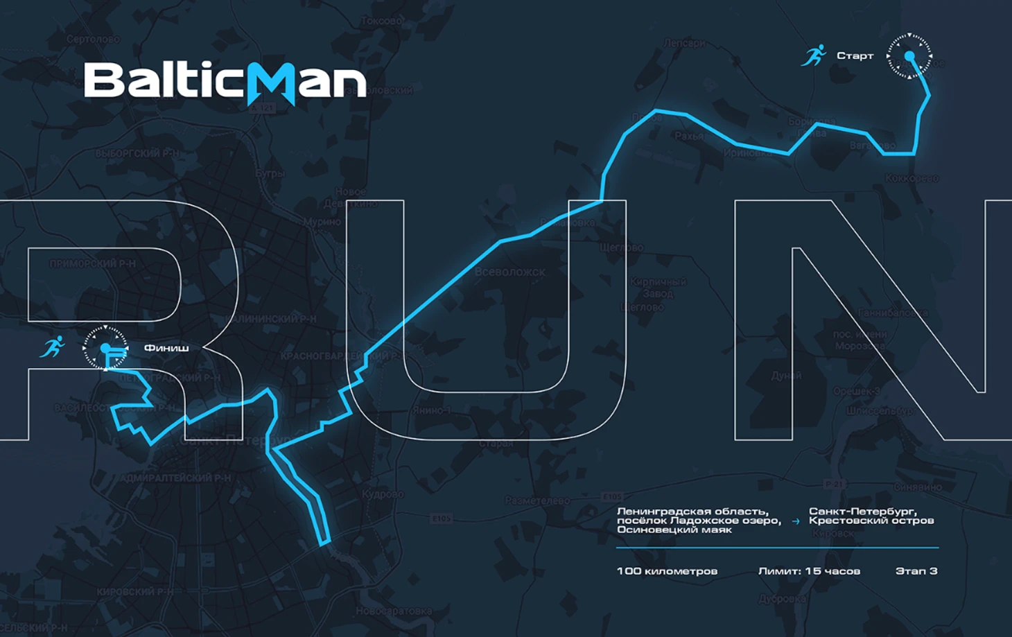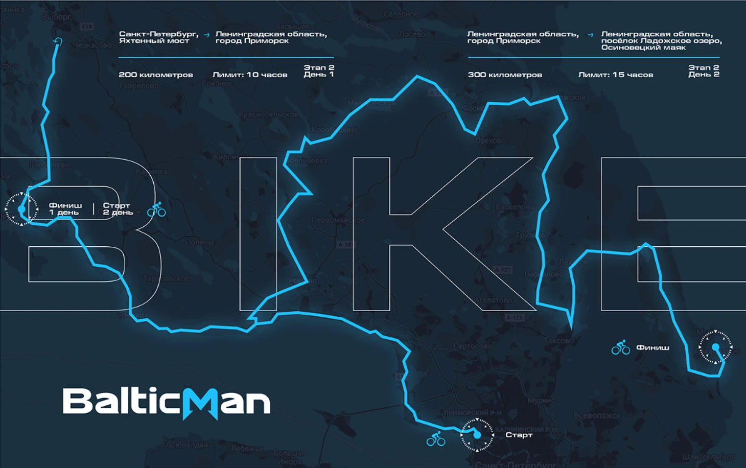 BalticMan - это ультрагонка в Санкт-Петербурге. День 1 - Плавание 28км + Велосипед 200км (разделка). День 2- 300км велогонка с раздельным стартом. День 3 - Бег по асфальту 100км до Сибур Арены. Гонка проходит на полном самообеспечение участника. Обязательно каждому участнику нужна команда поддержки, которая будет сопровождать его на велоэтапе и частично на беге. Команда в данной гонке решает 100% всех ваших усилий, без команды финишировать в этой гонке не возможно. Питание на велогонке подают саппорта, замена запчастей так же на саппортах, питание на беге все на команде. От того насколько подготовлена ваша команда зависит исход вашей гонки.