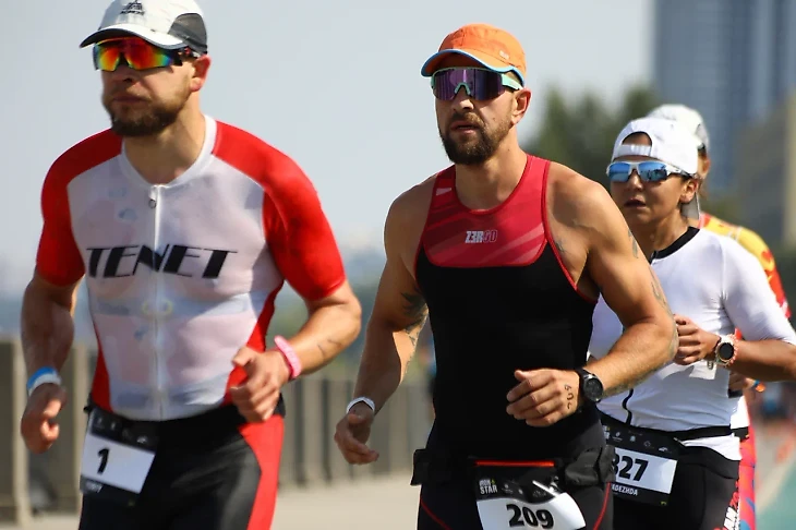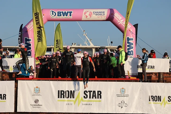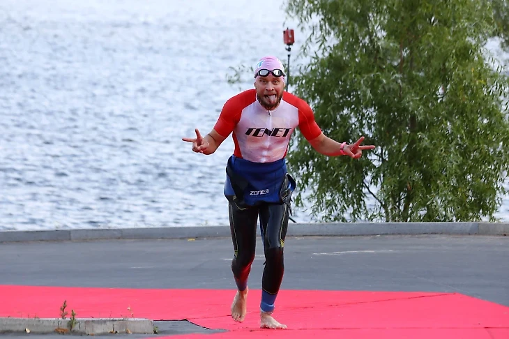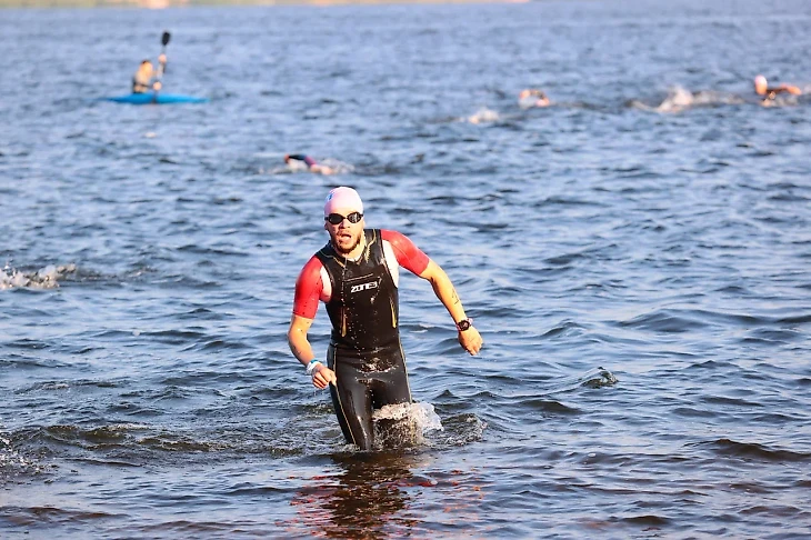 Нас в 6:10 погрузили на три теплохода и отвезли на баржу. Пока ехали на теплоходе, понимал ,что устал, переживал за бег, неполадки и скорая настройка велосипеда тоже дали повод для беспокойства, сил не хватало и хотелось не стартовать, настрой был совсем не боевой. На барже мы ожидали примерно 30 минут пока начнутся старты элиты. В 7:10 начались возрастные группы, я встал в четвертую линию и понеслась. Гудок , флажки убраны, отсечка часов о начале и прыжок в бездну - 1,5 метра вниз с помоста Баржи показались вечностью, было страшно ,но я как настоящий мамкин герой,не смотрел вниз, а полностью отдался свободному полету в неизвестность...бух, вода ушла в стороны , всплыл и без разбора взял направление вправо и начал топить по течению, его было не заметно и не ощущалось, но все мы , кто стартовал в тот день ощутили болтанку как в шторм, а ты маленький кораблик ,который пытается поймать волну и не утонуть вверх, вниз, вверх, вниз и я стараюсь на длинном гребке спокойно рассекать воду, в целом получалось и без суеты я продвигался быстро вперёд, буйки было видно хорошо, плыл расслабленно и технично как отрабатывали с Пашей на тренировках. Вокруг не было никого, ушарашил хорошо и плыл свободно, потом начал догонять и обгонять тех ,кто стартовал впереди. Буйки проносились быстро, ветер и волны становились сильнее, но я держал ориентир по буйкам и и облизывал их ,не плавая лишнего.