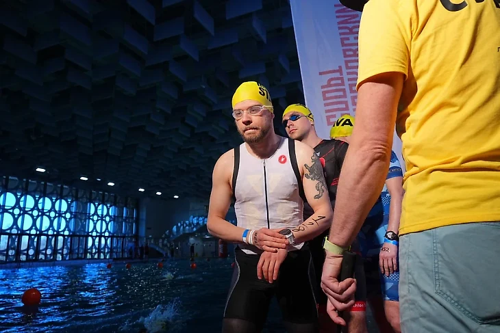 Старт был в несколько волн, стартовали сначала мужчины, я чудом попал во вторую волну, хотя всегда хотел в первую, мои коллеги по цеху более слабые на плавании как-то умудридись попасть в первую волну, и я задаюсь вопросом, как организаторы вообще распределяли участников)) по темпу плавания они точно этого не делали). Встал в начало стартовой волны , и понеслась.. Аккуратно прыгнул в басик, немного залилась вода в очки, но было уже пофиг, я в гонке , ща накатим, плылось очень тяжело на каждом буйке при развороте толкаться от борта было нельзя и скорость на плавании в конце каждого бассейна падала в ноль и приходилось с места брать убиственный по силам рывок, от того терялась техника. Волнорезы нам убрали, от того параллельные пловцы и все их потуги от кривого плавания разлетались во все стороны, вода заливалась в рот, штормило хорошо, до второго баса рубился с парнем он никак не хотел пропустить меня вперед, к третьему басу уже взял отрыв и сел в ноги к еще одному парню и плыл так в ногах до конца, время 6:57мин, на 20 сек почти хуже планируемого из-за всех этих драк в воде) Плавание- контактный вид спорта)