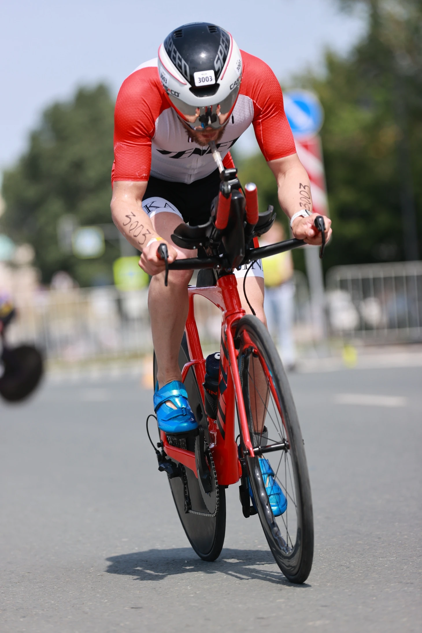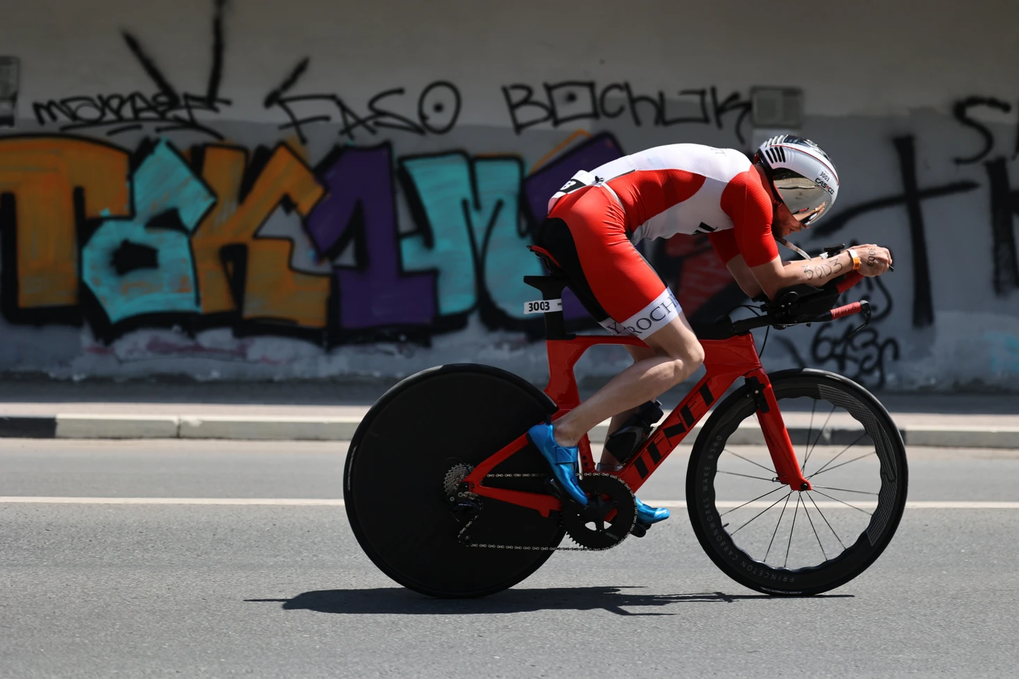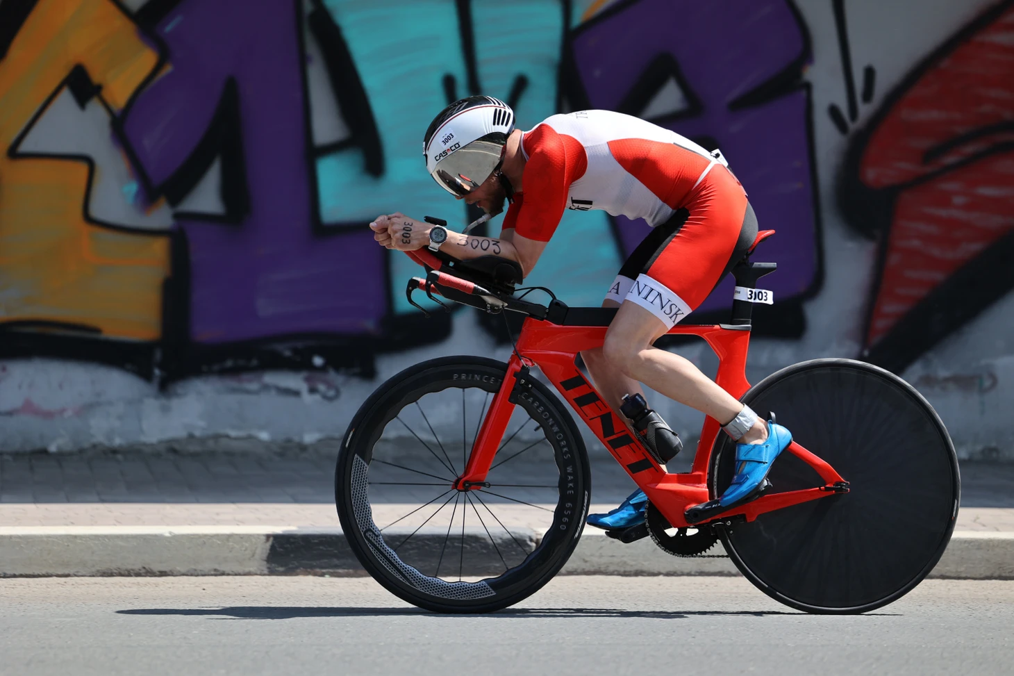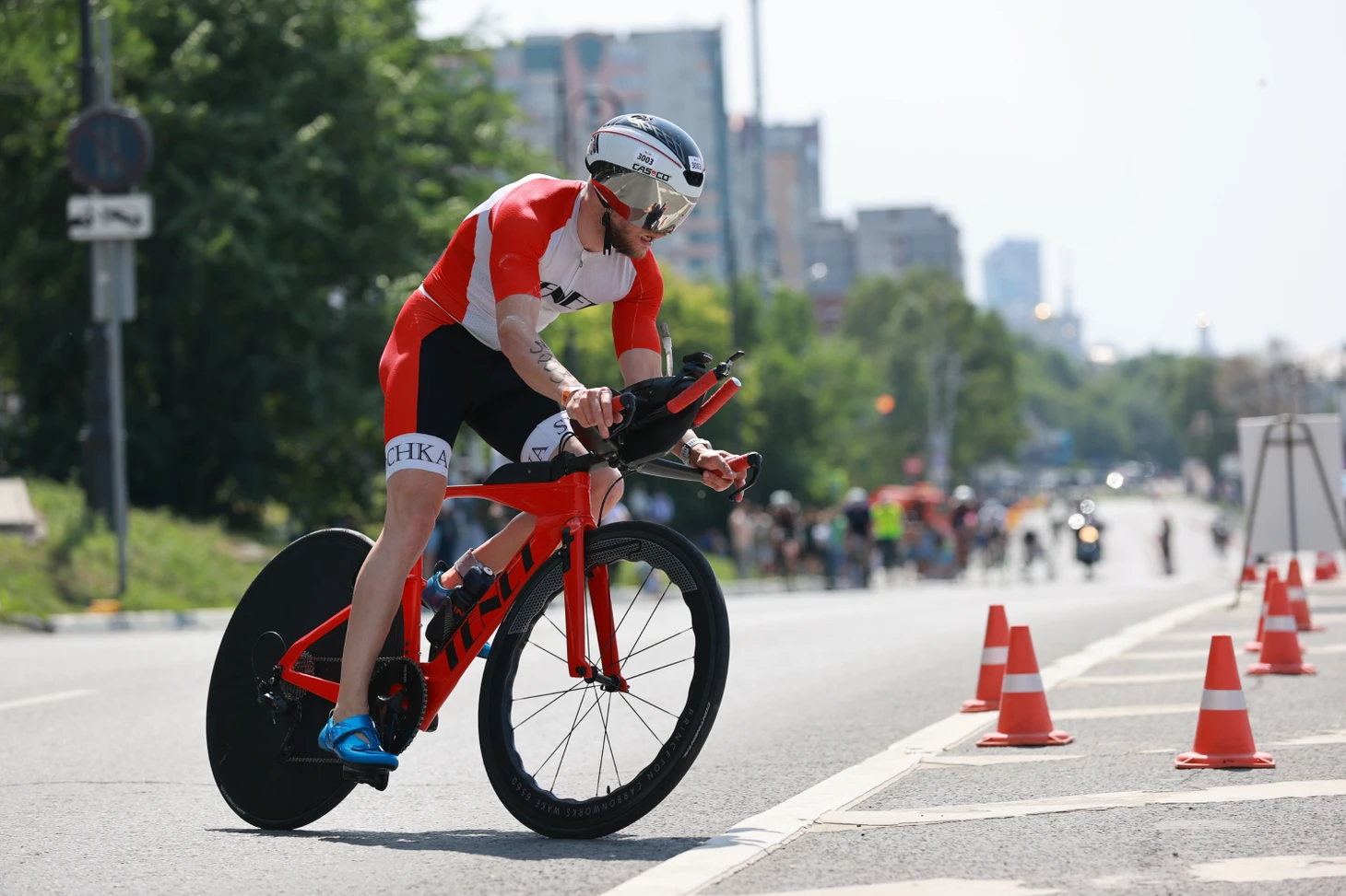 Велосипед Выход из Т1 , белая линия посадки на байк пройдена, занёс ногу , обул правый ботинок, толчок и вел покатил вперёд, сразу носок левой ноги заходит в туфлю и я начинаю раскручивать педали чтобы набрать скорость , нажал кнопку на часах и кнопку на велокомпе. Поправил быстро левый туфель, застегнул и начал раскручивать диск в подъем 300вт , переключил на полегче ,вспоминая наставления Бати спокойно заезжать в гору. Выезд на трассу, сразу ложусь на лежаки и начинаю долбить на целевой темп, пульс 173чсс , благодаря плаванию и дикому стрессу на нем, сердце работало уже в начале велика на отлично и не надо было разгонять мотор, кровь лилась по венам во все уголки тела, я был жив и полон если не сил, то решительности разорвать велоэтап так как смогу быстро.