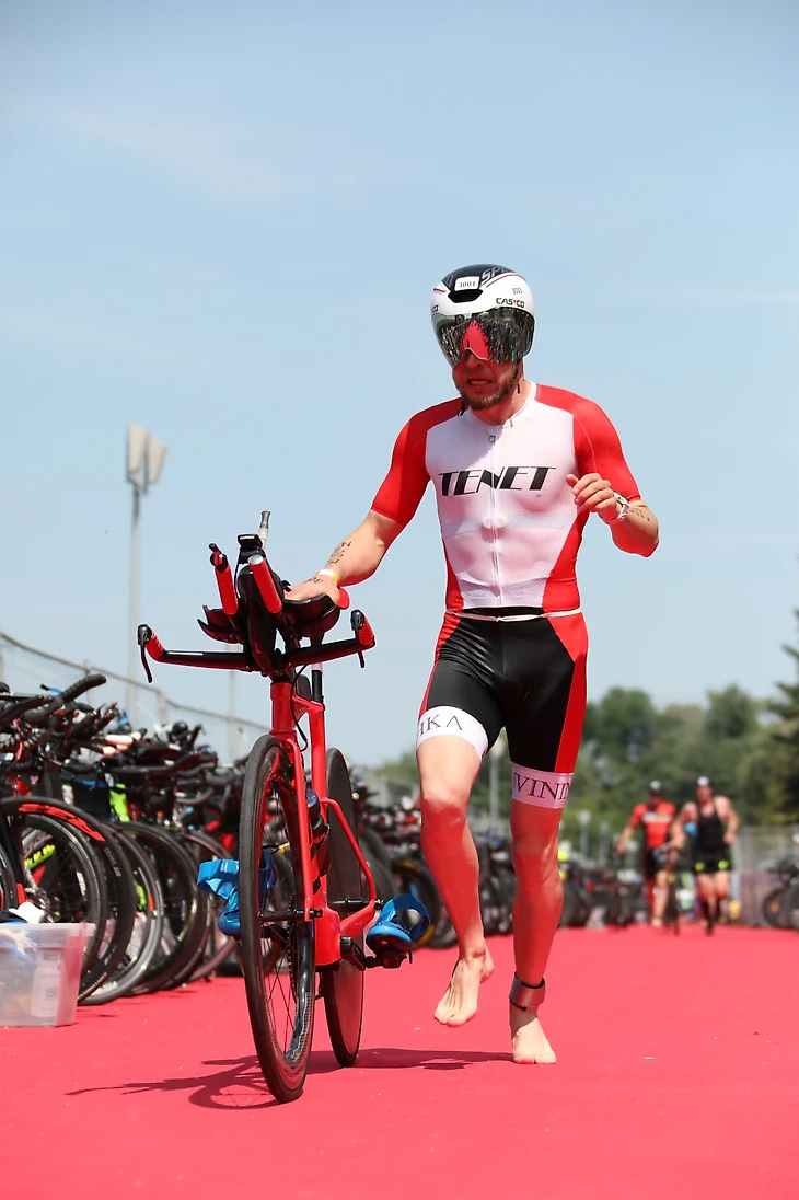 Т1 Подъем горки как мне кажется бежится жутко медленно, вот он заканчивается и понимаю,что уже бегу нормально, начинаю накатывать быстрее, заранее я запомнил ориентиры где стоит мой велик, дальше белых палаток раздевалки и рядом табличка "элита женшины" , забавно конечно))) после палаток стягиваю очки и шапку, быстро кидаю в контейнер в дальний угол. Стягиваю костюм быстрыми движениями. Одеваю через ноги номер на бельевой резинке и шлем, получилось застегнуть быстро, застёжку я так пока и не поменял. Гидрач кинул следом в контейнер и побежал с великом к выходу из транзитки, попутно включил велокомп.