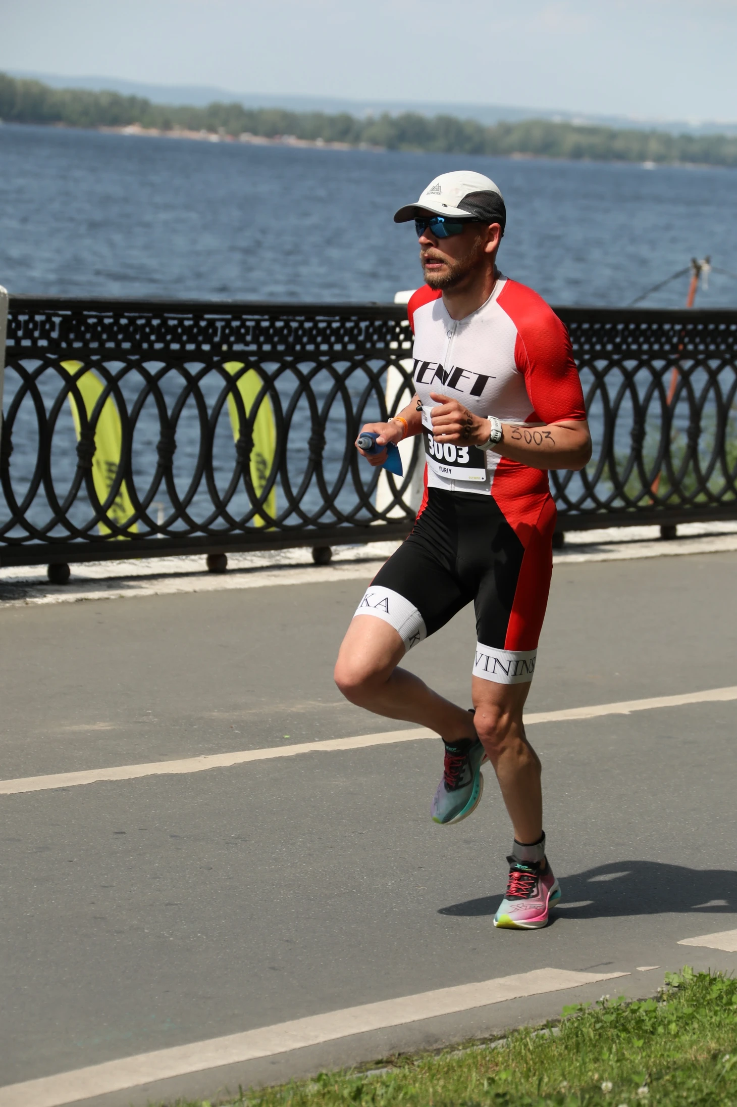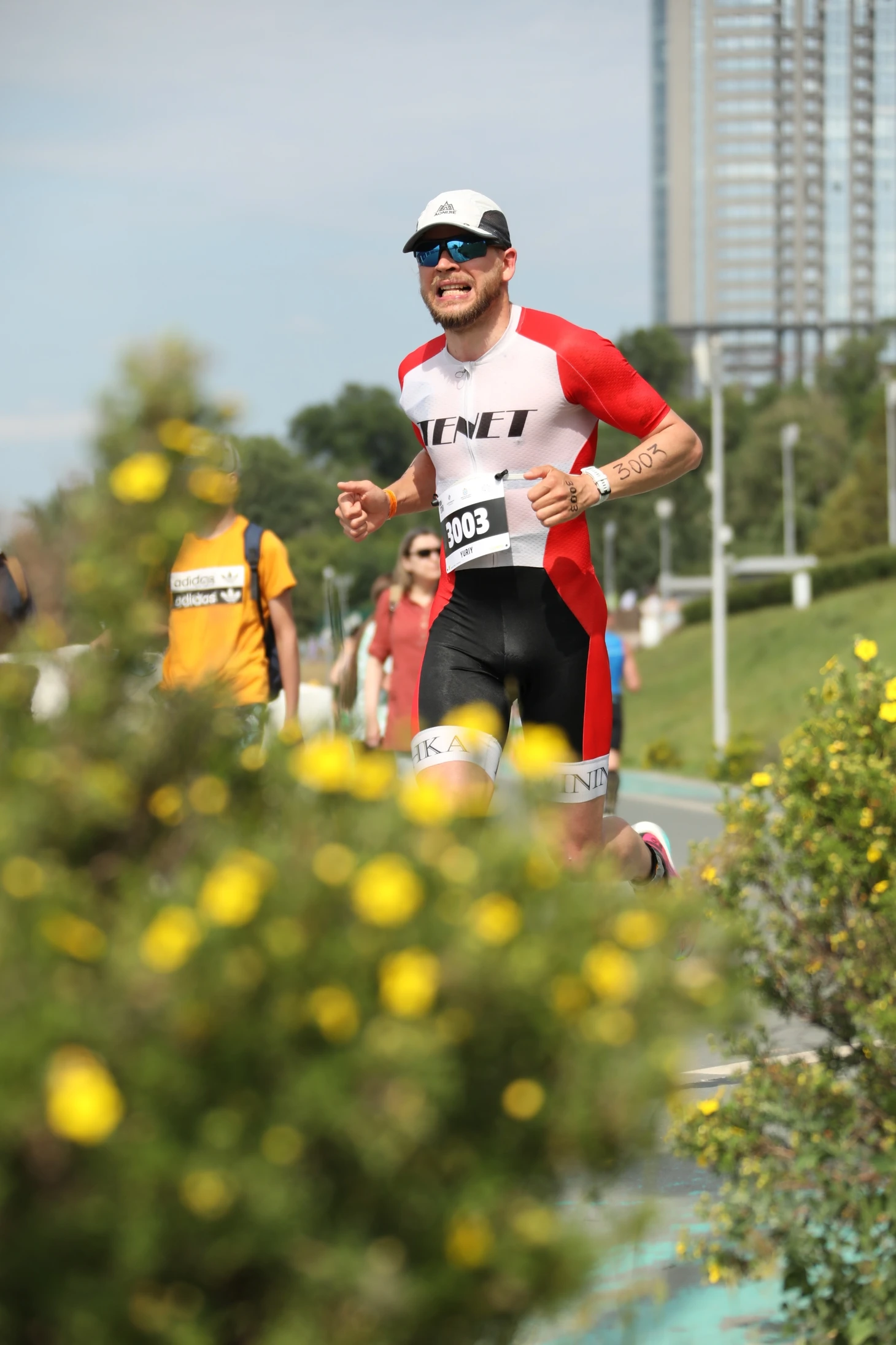 Выбегаю на асфальт , слева контейнеры с водой, чтобы смыть с ног воду, быстро опустил одну ногу и сразу вторую, бегу дальше, Таня кричит, что ещё нет результатов плавания по отсечкам и не понятна моя позиция , киваю и работаю в горку , очень тяжело бежать....