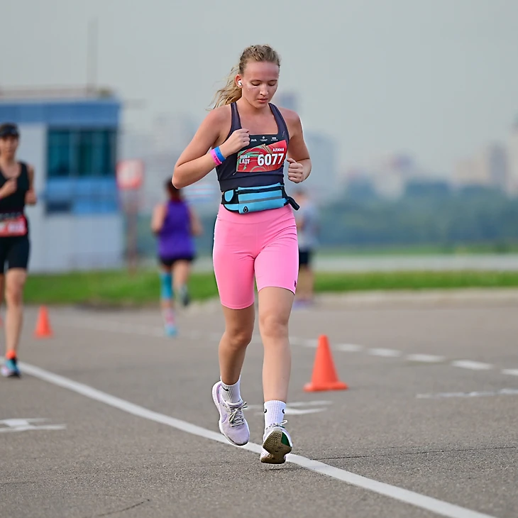 Розовые велосипедки на удачу, блестки на щеках и огонь в глазах побороли мой страх. Весь забег была мысль: «Как добраться до финиша в этой сауне?». Асфальт и Гребной канал адски парили после дождя.