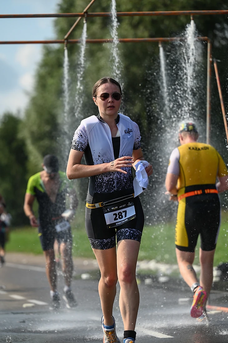 Вел хорошо пошел, я даже села в женскую пачку, достаточно долго проехала, но поняла не вытягиваю пульс растет, а силы на бег надо оставить, и тренер (Юра Ионов) предупредил, что надо поберечься. Отвалилась. Супруг заметил ситуацию на круге и орет «садись в пачку». Только я подумала, ее еще найти нужно и тут мне девушка подкатывает и спрашивает сколько ехать кругов, сказала еще два и спросила сколько она проехала, оказалось мы одинаково идем. Я предложила организовать пачку (как учил тренер), она говорит «я не опытная», так я тоже, давай пробовать, хороший шанс. Мы, конечно, не идеально, но ехали в пачке, к нам кто-то добавлялся и отваливался. Так мы до транзитки вместе и добрались. Потом смотрела результаты она обошла меня на беге.
