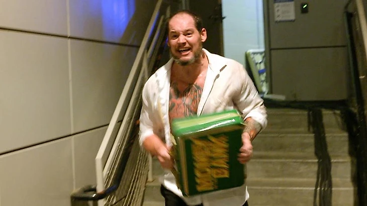 За кулисами Кайла спросила у Корбина, что его ждет дальше… но он, увидев Биг И, стырил у него чемоданчик Money in the Bank и убежал…