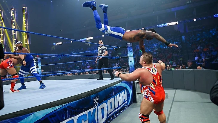 Начла матч Форд и Чэд. Немного классической стартовой «цепной» борьбы за инициативу, и Гейбл провел бросок с последующим болевым на руку. Монтез с этим справился, но Гейбл быстро вернул себе контроль… только для того, чтобы Форд ушел от всего этого, показав весь свой атлетизм. Обмен армдрэгами, попытками сворачивания и энзигури от Теза отправил Чэда прямо в его угол, где тэг забрал Отис. Форд встретил его дропкиком, провел пару ударов, но Отис оттолкнул от себя визави. Это, правда, позволило Анджело перехватить «слепой» тэг. Монтез получил мощный поп-ап пауэрслэм, но Докинс шарахнул бэк элбоу, пару страйков… и избежав бульдога, Отис провел эксплоудер. Ненемного «грязной» командной работы в углу последовало, и Чэд решил подбодрить напарника, хлопнул его по плечу, и рефери засчитала это как тэг. Гейбл стал объяснять, что это не было передачей права ведения боя, а Анджело тем временем пришел в себя и столкнул противников, из-за чего Отис обрушился на апрон. Монтез тут же полетел на него жестким дайвом через третий канат, но урона это не нанесло (по задумке, я так понял, Отис должен был его поймать и впечатать в баррикаду, но Форд просто перелетел соперника), и здоровяк швырнул Теза в ограждение, но не успел вернуться в ринг, чтобы разорвать удержание Анджело после спиннинг butterfly суплекса. Победа Street Profits.