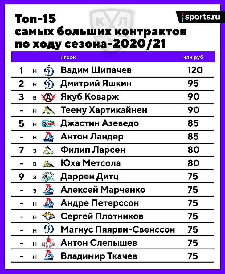 В новом майском списке все те же 10 хоккеистов, что по ходу этого сезона входили в топ-10 (который на самом деле топ-15) по зарплатам. Минус Яшкин, Азеведо, Ландер, Пяярви-Свенссон, Коварж. Первые трое покинули КХЛ, Пяярви с его игрой больше никто не даст таких денег в России, а Коварж просто упал по зарплате.
