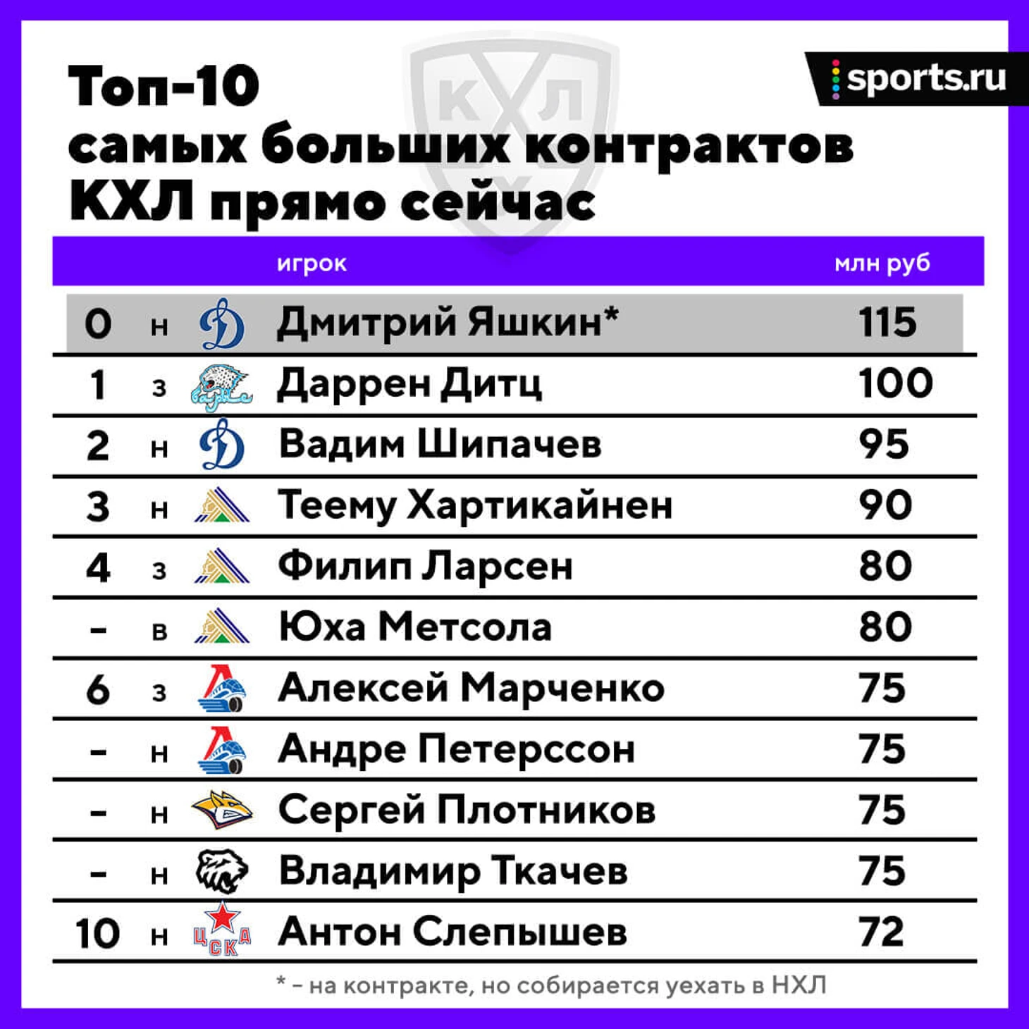 Таким образом, самый высокооплачиваемый игрок КХЛ – и единственный с девятизначной суммой в контракте – оказался в «Барысе»: защитник Даррен Дитц. Вот как выглядит первая десятка + Яшкин вне конкурса.