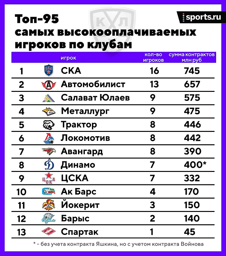 Пока же посмотрим на контракты хоккеистов к концу мая. Сразу оговоримся: в отличие от «СЭ», мы не стали учитывать зарплату Яшкина в сезоне-2021/22 (хотя и указали ее) – этим летом он должен уехать в НХЛ, несмотря на действующее соглашение с «Динамо». Клуб согласился отпустить игрока досрочно, но в случае неудачи за океаном он вернется к бело-голубым.