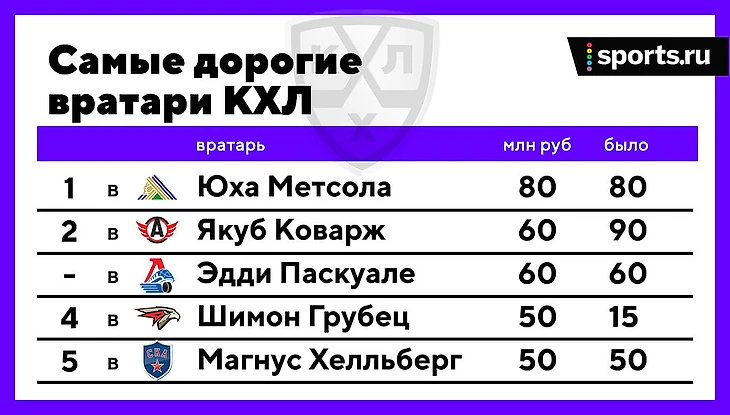 Метсола стал самым высокооплачиваемым кипером в КХЛ, но какой в этом толк, если Уфа получает 0-4 от «Ак Барса», а финн – только 15-й по отраженным броскам и 9-й по коэффициенту надежности? Даже Грубецу с его статусом «привел «Авангард» к Кубку Гагарина» в Балашихе положили только 50 млн.