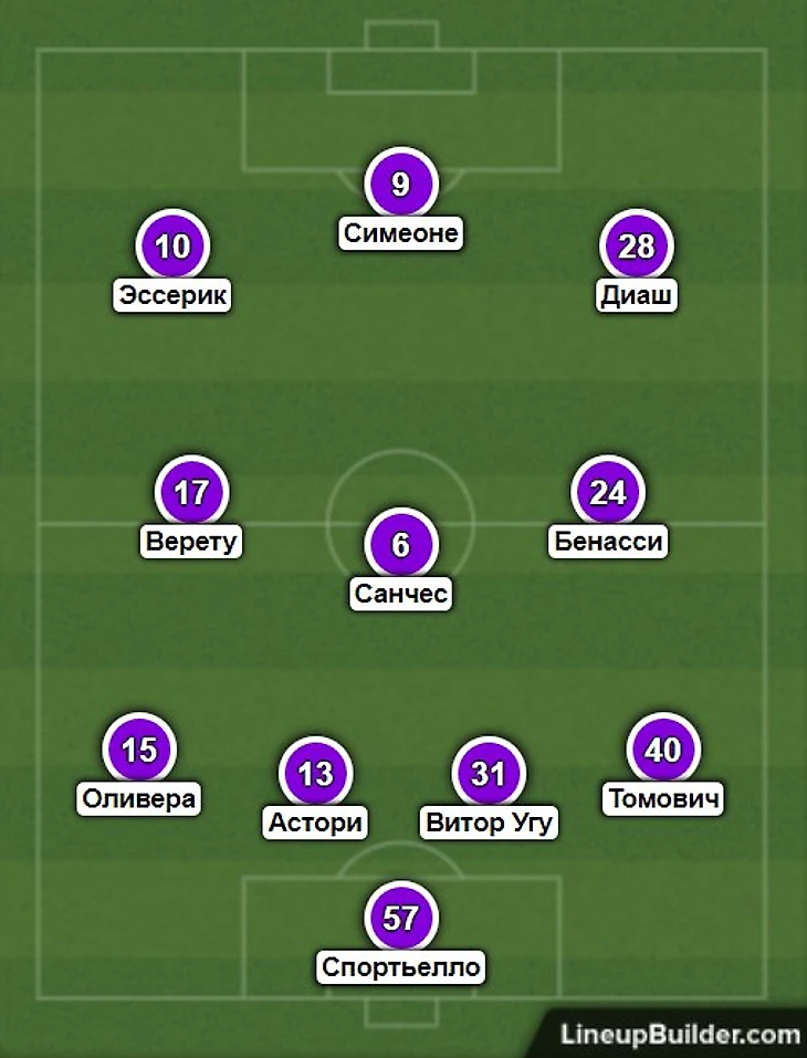 Против "Интера" во вчерашнем матче, согласно информации, которую даёт официальный сайт "Фиорентины", "фиалки" вышли играть по схеме 4—3—3 (см. рис. ниже). Нельзя сказать, что подобный состав не был выводим из того, что показывал тренер на предсезонных играх, однако дебют только перешедшего Симеоне вместо считающегося специалистом по "Интеру" Бабакара однозначно удивил.