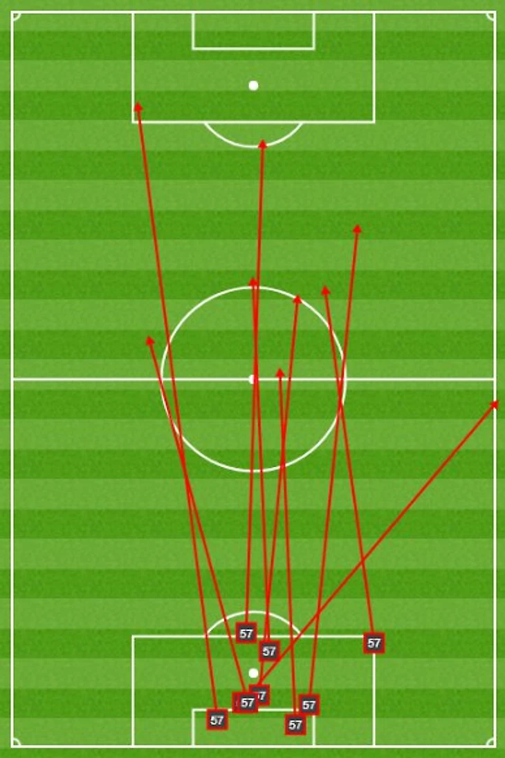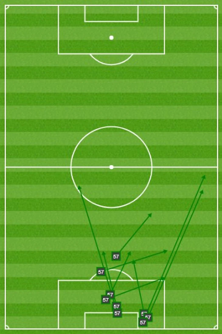 За начало атаки чаще всего отвечал Верету, опускаясь ближе к защитникам для розыгрыша мяча. Впрочем, данный способ выхода из обороны ещё нуждается в доработке: достаточно вспомнить, как из-за недопонимания между французом и Витором Угу защитник подарил мяч Икарди, организовав форварду выход один на один, не закончившийся голом лишь благодаря уверенной игре Спортьелло. Вторым способом выходить из атаки были длинные передачи, и здесь также не обошлось без Жордана (4 успешные длинные передачи из 6), однако за этот компонент отвечал прежде всего Витор Угу (7 переводов из 9 попыток). Что касается участия голкипера команды, Марко Спортьелло, в начальной фазе владения мячом, то здесь ситуация обратная: непонятно, в чём заключается причина такого контраста, но все передачи, выполненные итальянцем за центральную линию поля, оказались неточными (см. первый рис. ниже), а все передачи до центра поля дошли до адресата (см. второй рис. ниже).