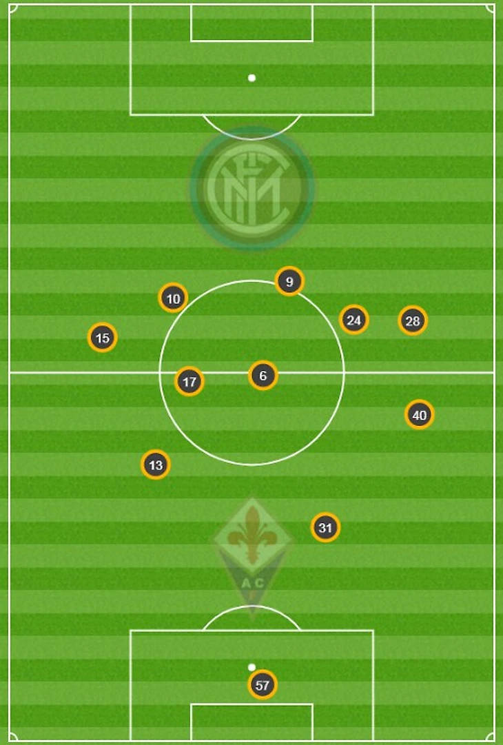 Дебют Симеоне — пожалуй, самого громкого трансфера межсезонья для "фиалок" — получился интересным: игрок, несмотря на не самые выдающиеся физические данные, периодически выигрывал воздушные дуэли у центральных защитников Интера, активно участвовал в прессинге и даже имел возможность заработать пенальти в конце первого тайма. Более чем достойное начало карьеры в фиолетовой футболке. Бабакар, сменивший аргентинца, выглядел тоже неплохо, однако действуя в паре, нападающие могли бы проявить себя гораздо ярче и, возможно, даже уйти с поля, имея в активе забитый мяч. Но, к сожалению, этого сочетания Пиоли не попробовал.