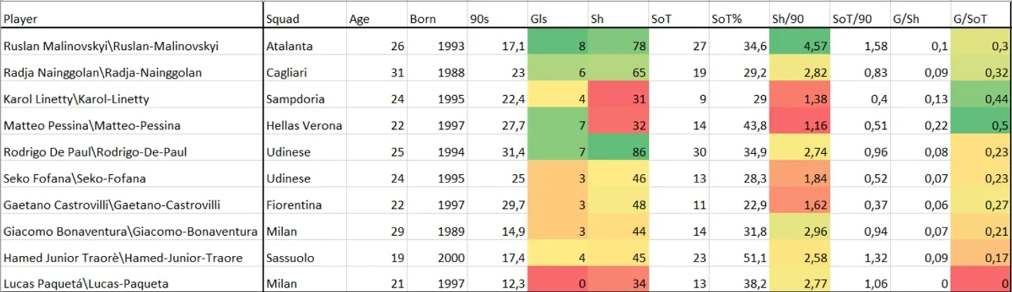 Допустим, тратить на игрока много денег нельзя, так что убираем Малиновского, Найнголана и Де Поля. Линетты и Фофана недавно сменили клубы, потому их тоже отсеиваем. Из оставшихся игроков по статистике выделяются Матео Пессина (7 забитых мячей) и Бонавентура с Пакета (2,96 и 2,77 ударов на 90 минут соответственно). Судя по всему, с Пакета менеджмент "Милана" упёрся рогом и отказался отпускать игрока без существенной компенсации в виде большой суммы денег и/или хорошего игрока взамен, а Пессина — не объёмный по ударам игрок (1,16 в среднем на 90 минут), проводящий первый сезон на высоком уровне и не забивший ни одного гола из своих семи ударом из-за пределов штрафной.
