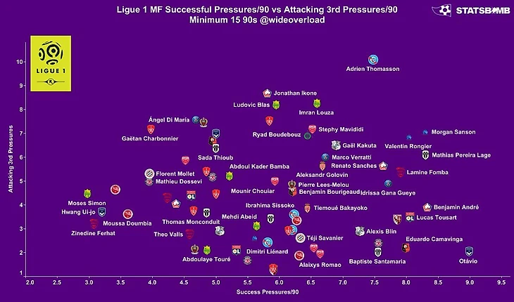 - Адриен — игрок, способный много и успешно прессинговать. Ниже — данные по объёму прессинга (ось Y) и количеству успешно оказанных давлений (ось X); вся статистика — в пересчёте на 90 минут
