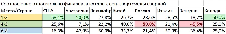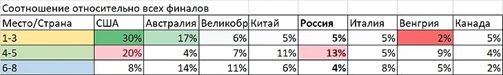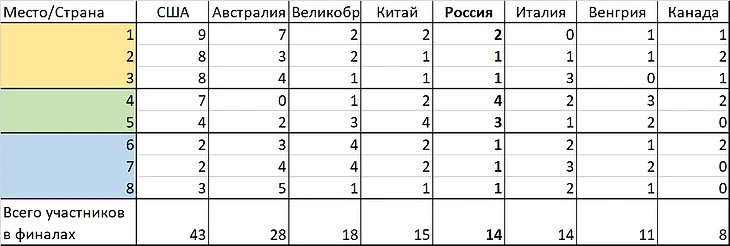 Можно уже заметить, что у России 4 четвертых места, больше только у США, но у них и представительство в финалах в 3 раза больше. Вторая таблица как раз показывает распределение мест среди спортсменов лидирующих стан, если они отбираются в финал.