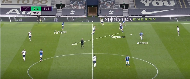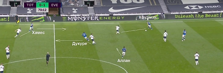 Игра «на третьего» – данный прием как раз использовался, когда построение команды было по схеме 4-3-3 с одним опорников в лице Аллана. Мяч был переведен на Коулмэна. Дукуре снова видит возможность смещаться в полуфланг, который освобождает Хамес, стягивая за собой крайнего защитника «шпор». Дукуре при этом тянет за собой опорника Уинкса, оставляя Аллана свободным. В итоге, пас от Коулмэна идет на Хамеса, тот в касание отыгрывает на открытого Аллана. При этом Дукуре уже один стоит в свободном пространстве на фланге, и готов принимать передачу для развития атаки. Затем в центре уже подключается Коулмэн.