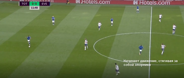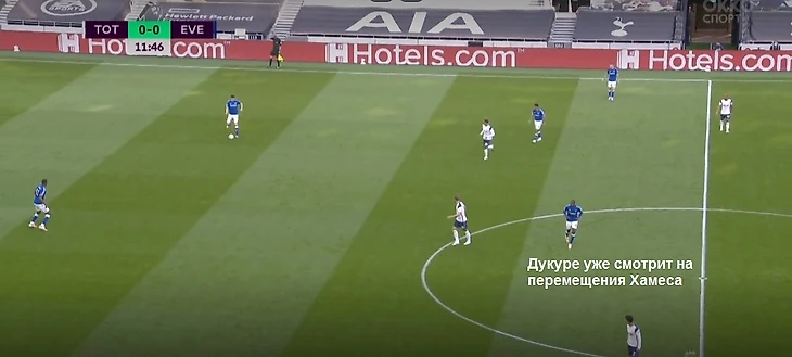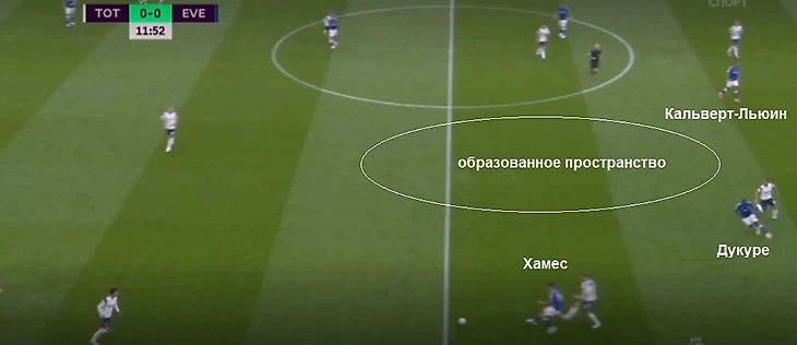 4. Вскрытие игроками «Эвертона» левого фланга защиты «Тоттенхэма» через активные перемещения и комбинационные действия. Не смотря на то, что 42% атак «ирисок» шли через левый фланг, на правом фланге тоже были интересные моменты. Когда Хамес уходил шире в край, открывалась его зона в полуфланге. Дукуре начинал двигаться именно в это пространство, уводя за собой опорника «шпор». В этот момент от Коулмэна шла передача на Хамеса, для которого уже открывалась зона в центре поля либо под пас на Кальверт-Льюина, либо для собственного продвижения с мячом. Однако, в данном эпизоде Хамесу пришлось делать перевод на другой фланг. У него, кстати, 12 длинных передач за игру.