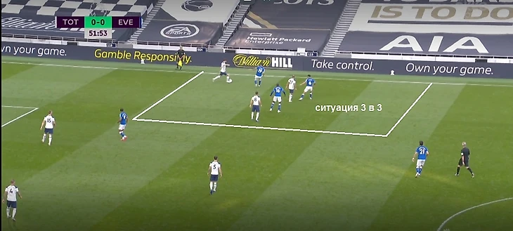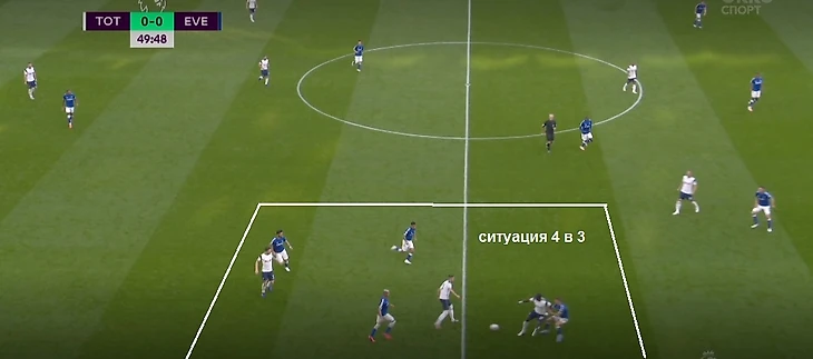 3. Свой прессинг «Эвертон обозначал в формации 4-4-2. Гомеш поднимался в пару к Кальверт-Льюину, Ришарлисон опускался ниже на фланг. Также на своем фланге действовал и Хамес. Гомеш и Доминик играли по центральным защитникам, Дукуре поднимался выше и давил на одного опорника «шпор», когда как на второго опорного линию передачи перекрывал Гомеш. Аллан заполнял пространство за спиной Дукуре. Ришарлисон и Хамес действовали по крайним защитникам. Агрессивного прессинга замечено не было, скорее «ириски» обозначали давления, встречая соперника высоко. Идея Анчелотти допускает сдержанную игру при прессинге соперника. Далее «Эвертон» опускался в средний и низкий блок.