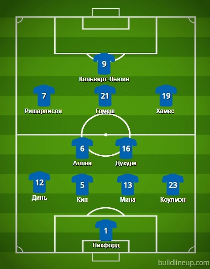 В матче с «Тоттенхэмом» Анчелотти выставил игроков по схеме 4-2-3-1, которую в прошлом сезоне он использовал в 14 матчах. Однако опорная зона и четверка игроков атаки претерпели изменения. Аллан и Дукуре вышли в паре опорных полузащитников. Под нападающим на позицию «десятки» вышел Андре Гомеш, справа на фланге Хамес, слева на фланге Ришарлисон. Кальверт-Льюин на позиции форварда.