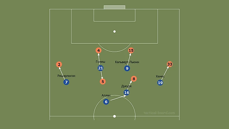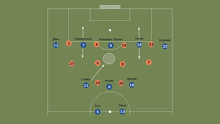 5. При игре с мячом активные перемещения по позициям демонстрировали Гомеш, Аллан и Дукуре. Таким образом, команда перестраивалась в 4-3-3, с одним опорником в лице Аллана. Дукуре и Гомеш поднимались выше в полуфлангах. Кроме этого, Хамес чаще смещался ближе к позиции «десятки», чем Гомеш, при этом освобождал свой фланг для подключения Коулмэна. В случае контратаки Дукуре страховал крайнего защитника, опускаясь в его зону ответственности. Гомеш, кстати, действовал больше в левом полуфланге, взаимодействуя с Ришарлисоном. Не смотря на то, что в схеме он обозначен, как «десятка», эта область была оставлена для смещения Хамеса. После того, как Гомеш был заменен, колумбиец еще чаще стал смещаться именно туда.
